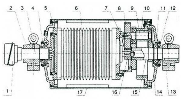 外裝式電動滾筒一般采用擺線針輪傳動,使電機外露與滾筒直聯,可取代電動機一減速機一傳動滾筒組成的老式驅動裝置。其內部結構圖如下:
